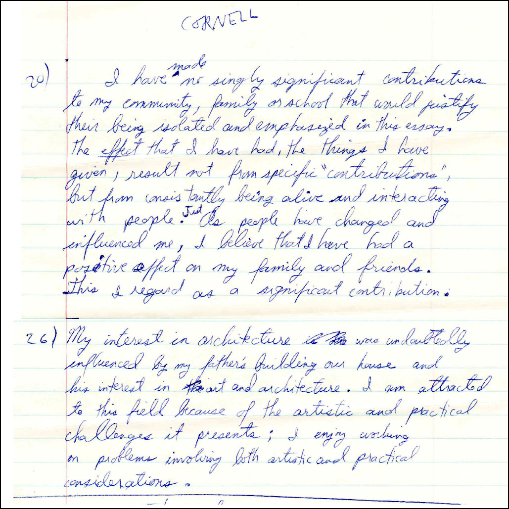 I write a draft application essay for Cornell's Department of Architecture, probably around Dec. 1969.