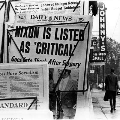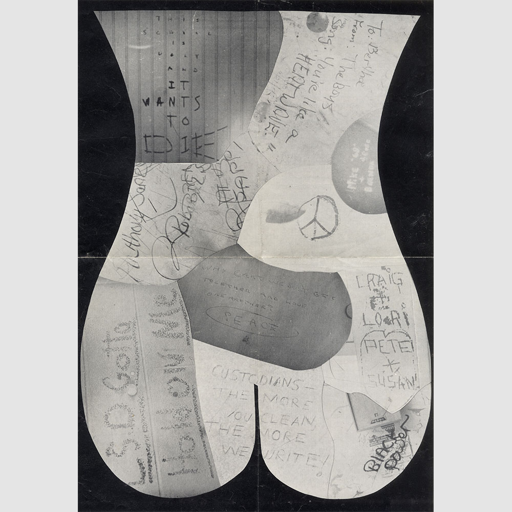 As layout editor for the New Rochelle High School student newspaper (The Huguenot Herald), I create this collage of school graffiti under the direction of editor Gloria Borger, Feb. 1970.