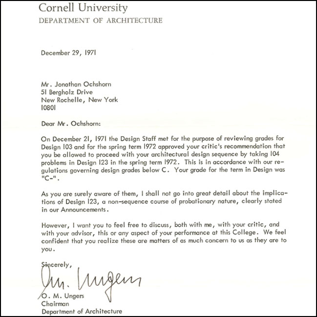 I don't do very well in the 2nd-year design studio at Cornell, receiving a C-, which triggers this probation letter from legendary Chair O.M. Ungers in Dec., 1971.