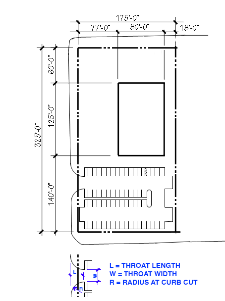Assumptions: It turns out that requirements for parking have an enormous impact on the design of such a building. For the purposes of this exercise, assume that each regular parking space is 8 feet wide and 18 feet deep, and that 2-way aisles between parking stalls are 24-feet wide, so that a "double-loaded" aisle with stalls on both sides would be 60-feet wide. Make sure that it is possible to actually get into and out of every parking space! Refer to these Texas driveway design guidelines for suggestions about curb cuts, minimum radii, and so-called throat dimensions. For this assignment only, you may use a 24-foot dimension for throat length, throat width, and the radius at the throat curb cut. Provide handicapped parking spaces as required by ADA guidelines. Do not provide an off-street loading space. Assume that 800 square feet per floor is assigned to non-office purposes (e.g., stairs, elevators, bathrooms). This assumption is important since requirements for parking are determined, not by total building floor area, but by total office floor area. Assume that the building is rectangular, with a minimum dimension of 30 feet in any direction. Also assume that a minimum of 10 feet width should be provided between the building and any parking spaces or parking aisles. The parking and aisles can be assumed to extend all the way to the property lines, irrespective of any setbacks or yards that constrain the placement of the building. Finally, assume that all off-street parking must be on the ground and not under, on, or in the building itself.