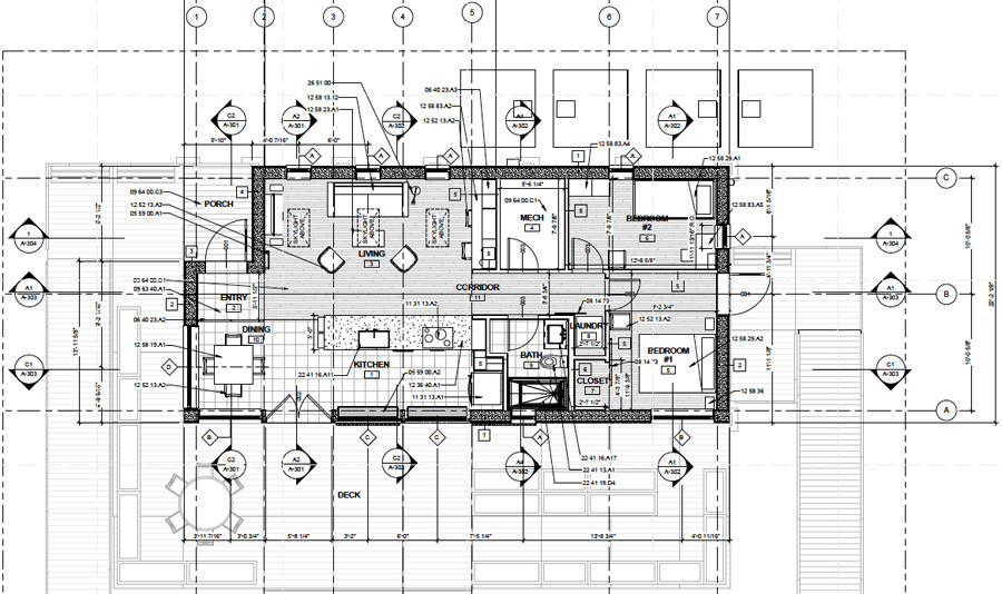 Try to find examples of "technical" floor plans in books, magazines, or online, including information on labeling column grids. But note that the AutoCad grid line recommendations are not consistent with those in the National CAD Standard (from Module 4 — Drafting Conventions; 4.2 Drawing Standards). The vertical grid line recommendations are the same, with numbers (1, 2, 3, etc.) going from left to right, but the horizontal grid line recommendations differ, with AutoCAD suggesting letters (A, B, C, etc.) going from the top to the bottom, and the NCS suggesting letters going from the bottom to the top. Follow the recommendations in the NCS.