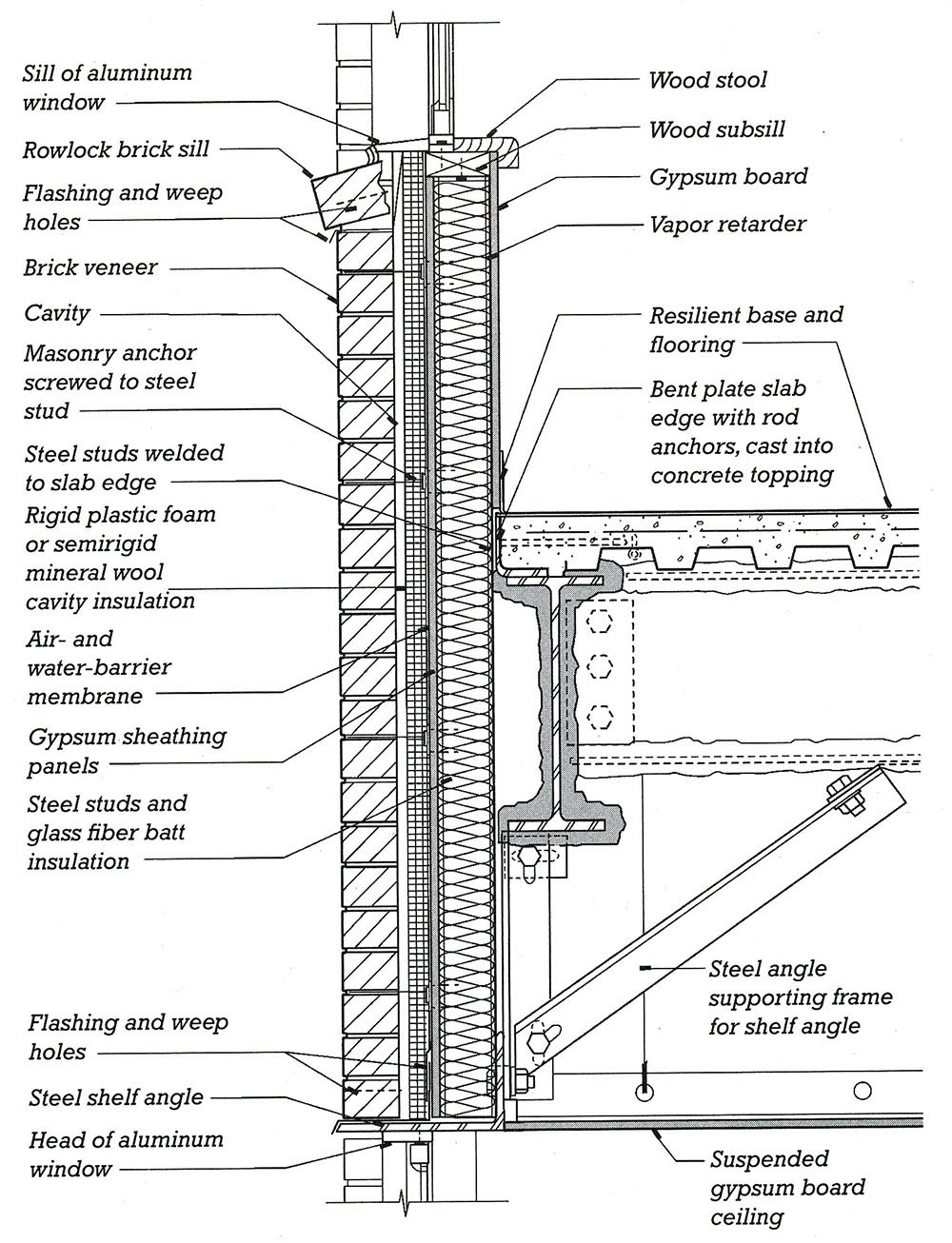 Pay particular attention to the continuity of all four control layers (thermal, vapor, rain water, and air), especially at the intersections of wall and glazing; and wall and roof. The air-vapor-rain water control layer can be combined as a single "rubberized" membrane applied directly over the exterior sheathing in the cavity (and rendered as a thick line); the thermal control layer can be 2"-thick rigid insulation adhered to the air-vapor-rain water membrane. The cavity (i.e., the air space between the insulation and the brick cladding) should be about 2 inches wide, and bricks can be drawn as approximately 4 inches wide. The height of typical bricks is about 2-2/3 inches nominally, i.e., including the mortar joint (so that the centerline-to-centerline height of 3 bricks courses is exactly 8 inches). The steel studs supporting the exterior sheathing can be assumed to be 3⅝ in. wide, with ⅝ in. sheathing.