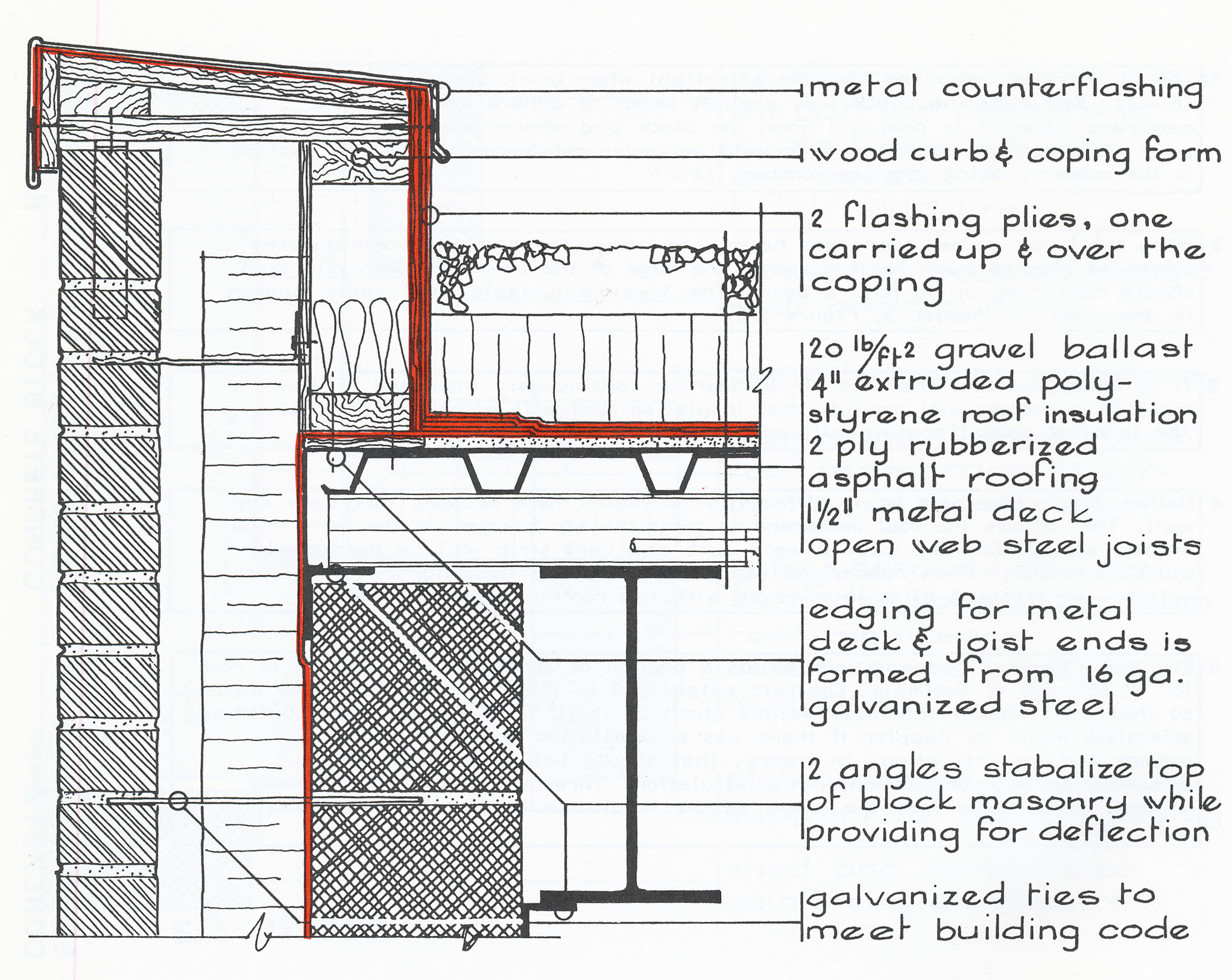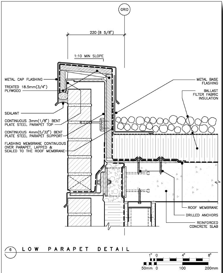 Detailing often involves modifying conventional standards in order to express a particular design idea. Often, several "standard" details are combined and/or adapted to achieve this goal. In this assignment, you are asked to modify the existing detail at the intersection of the stone veneer and green roof of Milstein Hall, shown in the detail reproduced below. Examine the existing detail, as well as the other references provided, in order to create a new detail according to the requirements listed below.