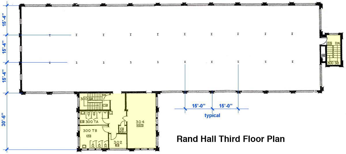 Sometimes, the best way to learn what's correct is to deliberately do something wrong. So, in that spirit, make a really bad proposal for a hypothetical renovation of the former third floor of Rand Hall (before it was converted into a library). Assume that the building is sprinklered and that the two egress stairs shown in the floor plan are legal and are to remain in place. Do not change anything in the plan areas shown in yellow and do not add any additional stairs. The required program elements are as follows: